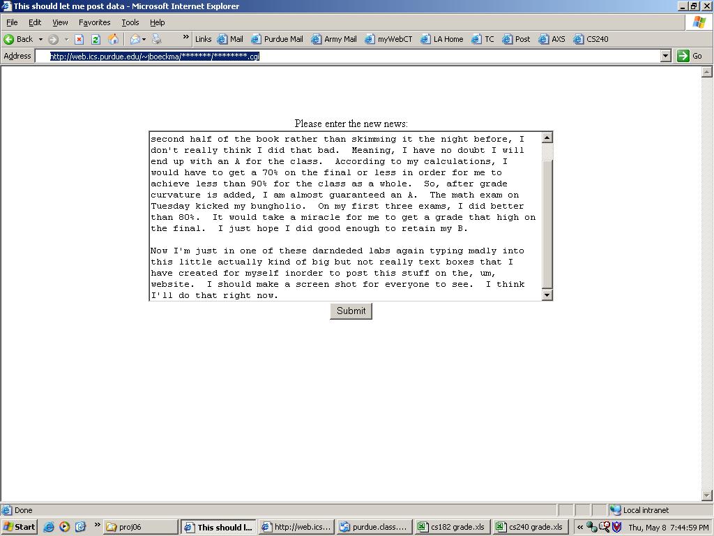 Now I'm just in one of these darndeded labs again typing madly into this little actually kind of big but not really text boxes that I have created for myself inorder to post this stuff on the, um, website. I should make a screen shot for everyone to see. I think I'll do that right now.