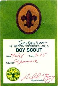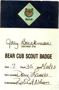 I began my scouting career as a Cub Scout while I was in third grade. I don't know why I joined, probably just because Jimmy and Matt were in it. I had to first get my Bobcat badge-it was the first rank in cub scouting-before I could go on to the badge of my grade level, which was the Bear badge. The Cub Scout pack there didn't have pinewood derbies but instead had balsa wood boat races. Two gutters were filled with water, and each person who had a boat would blow the sail on it to propel it down the gutter. The first boat to the end would win. I participated in the race the only year I was part of that pack, and did pretty well. I made it to the battle for second, but became nervous and kept running my boat into the side of the gutter. I ended up coming in third overall, and just like my luck, trophies were only given to the first and second places.