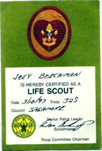 I have been involved in the Eagle Scout Projects of at least five scouts, including myself. Of these five, two have since attained the Eagle rank, but another three have gotten Eagle, though I was unavailable to aid with their projects. Jasin has most recently had his Eagle Court of Honor, which was Saturday the 15th of December 2001.